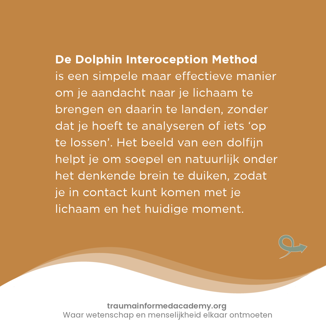 De Dolphin Interoception Method is een simpele maar effectieve manier om je aandacht naar je lichaam te brengen en daarin te landen, zonder dat je hoeft te analyseren of iets ‘op te lossen’. Het beeld van een dolfijn helpt je om soepel en natuurlijk onder het denkende brein te duiken, zodat je in contact kunt komen met je lichaam en het huidige moment.