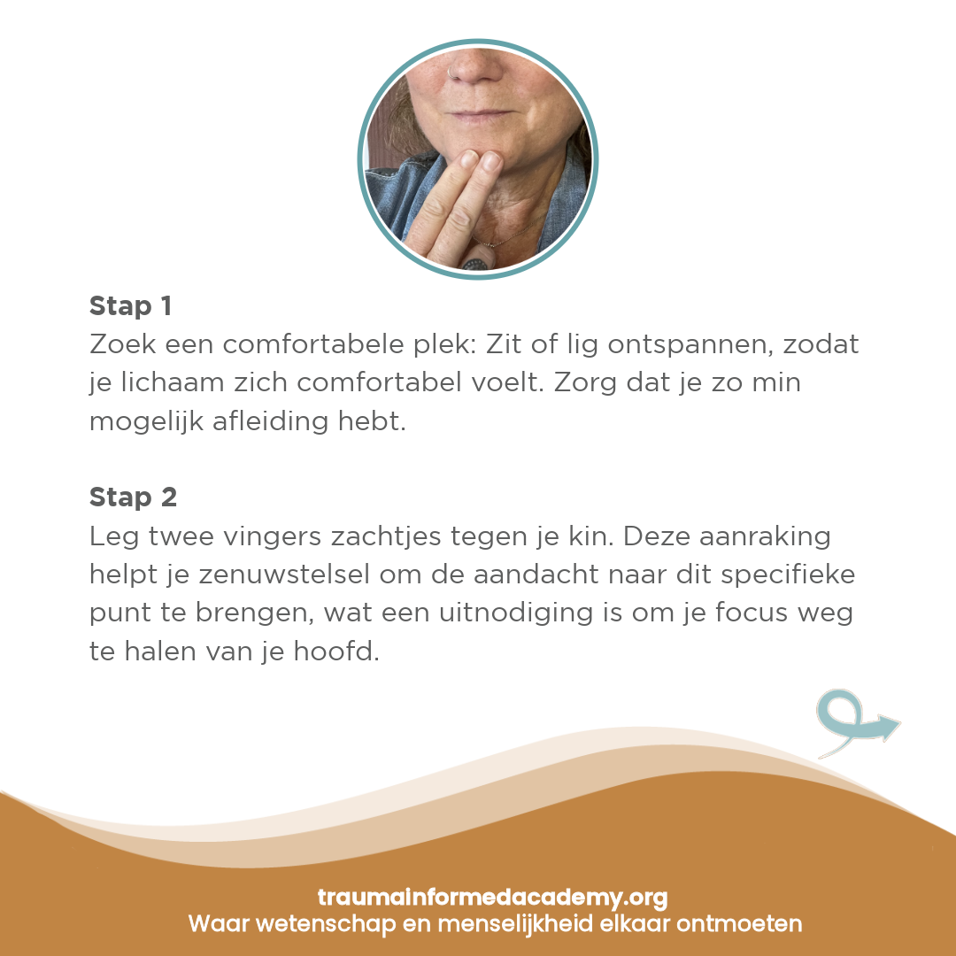 Leg twee vingers zachtjes tegen je kin. Deze aanraking helpt je zenuwstelsel om de aandacht naar dit specifieke punt te brengen, wat een uitnodiging is om je focus weg te halen van je hoofd. - Stap