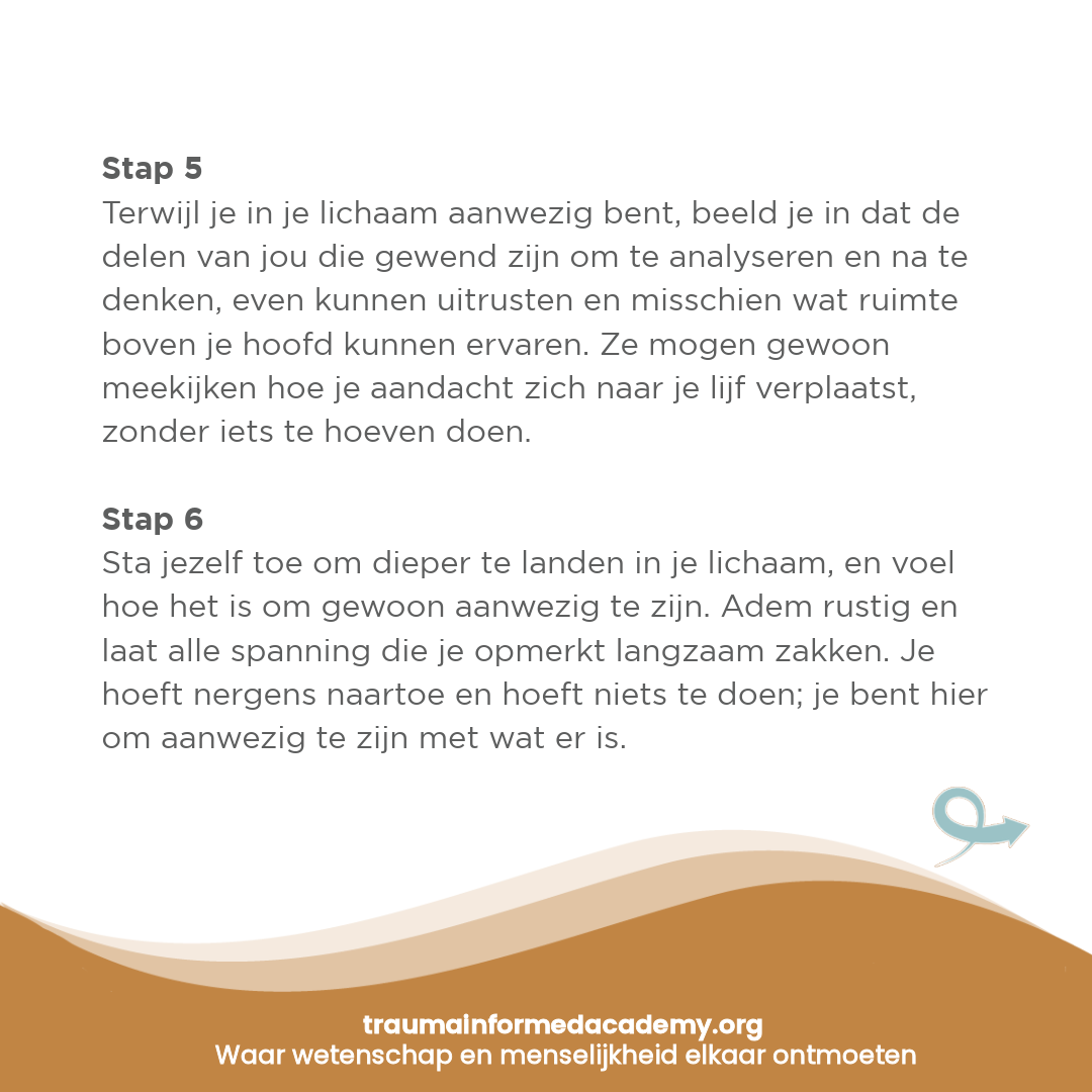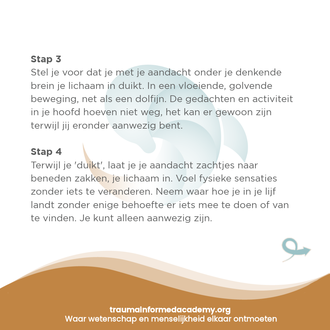 Stel je voor dat je met je aandacht onder je denkende brein je lichaam in duikt. In een vloeiende, golvende beweging, net als een dolfijn. De gedachten en activiteit in je hoofd hoeven niet weg, het kan er gewoon zijn terwijl jij eronder aanwezig bent. - Stap