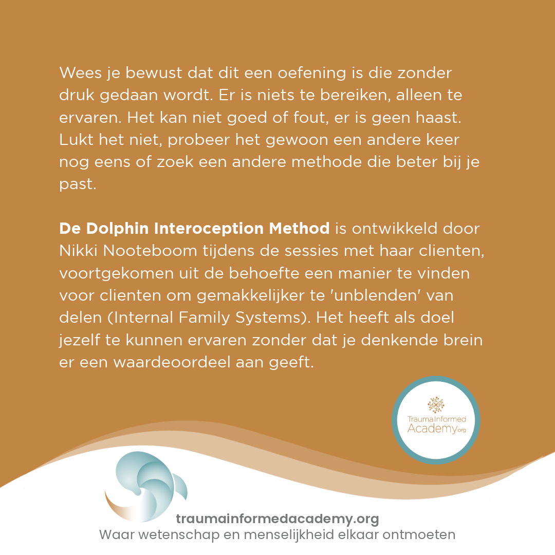 De Dolphin Interoception Method is ontwikkeld door Nikki Nooteboom tijdens de sessies met haar cliënten, voortgekomen uit de behoefte een manier te vinden voor cliënten om makkelijker te ‘unblenden’ van delen (Internal Family Systems). Het heeft als doel jezelf te kunnen ervaren zonder dat je denkende brein er een waardeoordeel aan geeft.